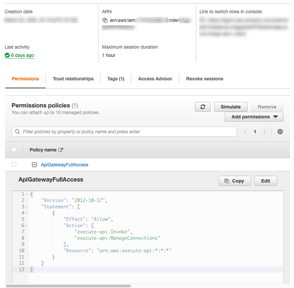 Following is the permission policy needed to enable full access to the API gateway.